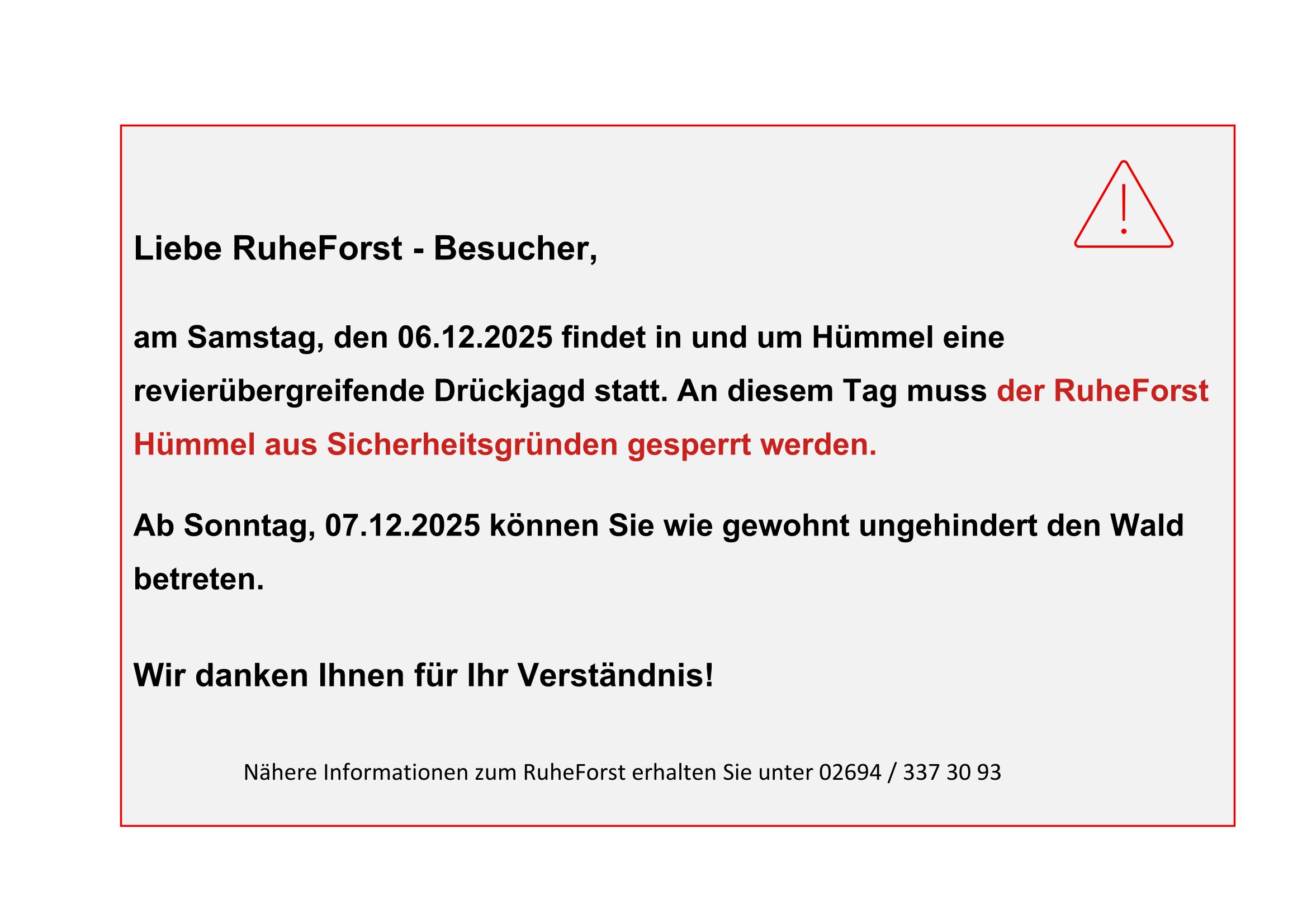 Da die angrenzenden Wälder bis an den RuheForst bejagt werden, muss an diesem Tag aus Sicherheitsgründen der RuheForst Hümmel für Besucher gesperrt werden.